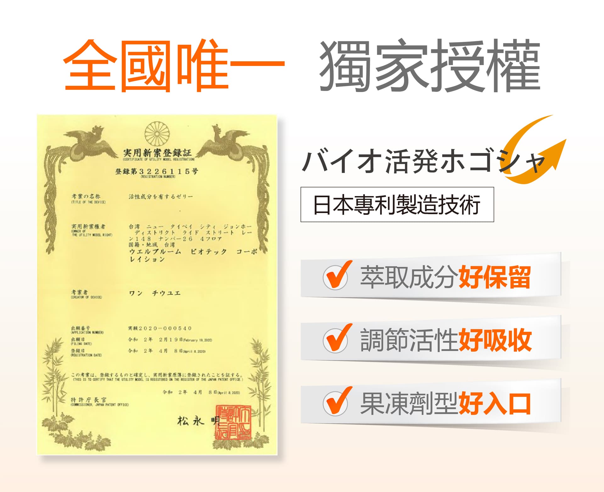 純水、蔗糖、百香果濃縮果汁、綜合膠體(刺槐豆膠、蒟蒻粉、玉米糖膠)、檸檬酸鈉、檸檬酸、金盞花萃取物(金盞花萃取物(含葉黃素、玉米黃素)、糊精、蔗糖、阿拉伯膠、辣椒精華、維生素C(抗氧化劑))、DL-蘋果酸、維生素A(乾燥葡萄糖漿、阿拉伯膠、玉米澱粉、維生素A乙酸酯、維生素E(抗氧化劑))、枸杞萃取(枸杞萃取、麥芽糊精)、山桑萃取(山桑萃取、麥芽糊精)、蔗糖素(甜味劑)、黑醋栗萃取、微藻粉(辛烯基丁二酸鈉澱粉、DHA油脂、蔗糖、葡萄糖、抗壞血酸鈉(抗氧化劑)、卵磷脂、維生素E(抗氧化劑)、L-抗壞血酸棕櫚酸酯(抗氧化劑))、紅藻萃取(紅球藻萃取(含蝦紅素)、維生素E(抗氧化劑)、中鏈三酸甘油酯、糊精、辛烯基丁二酸鈉澱粉、阿拉伯膠、二氧化矽、脂肪酸聚合甘油酯、羧甲基纖維素鈉、L-抗壞血酸棕櫚酸酯(抗氧化劑))作用