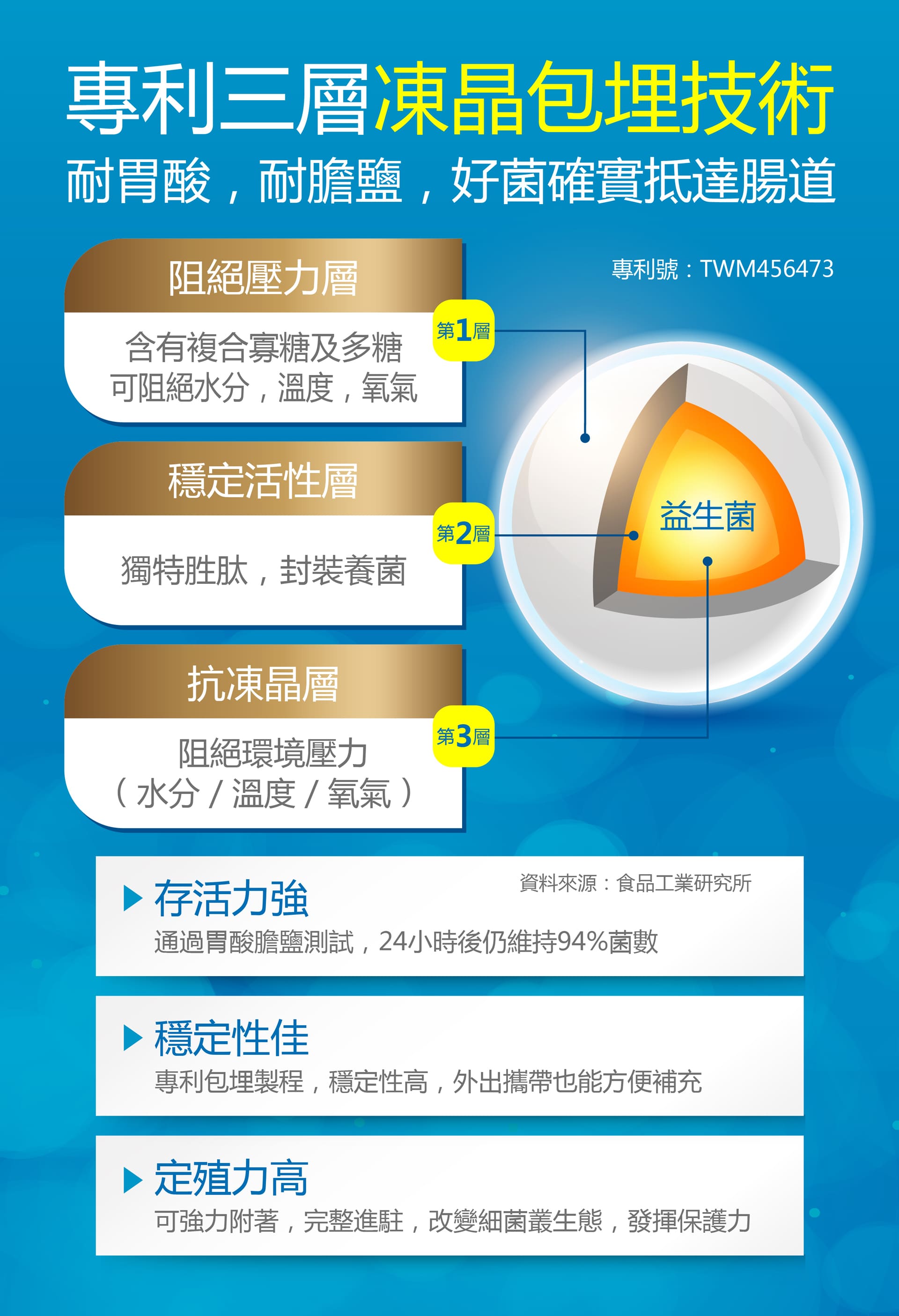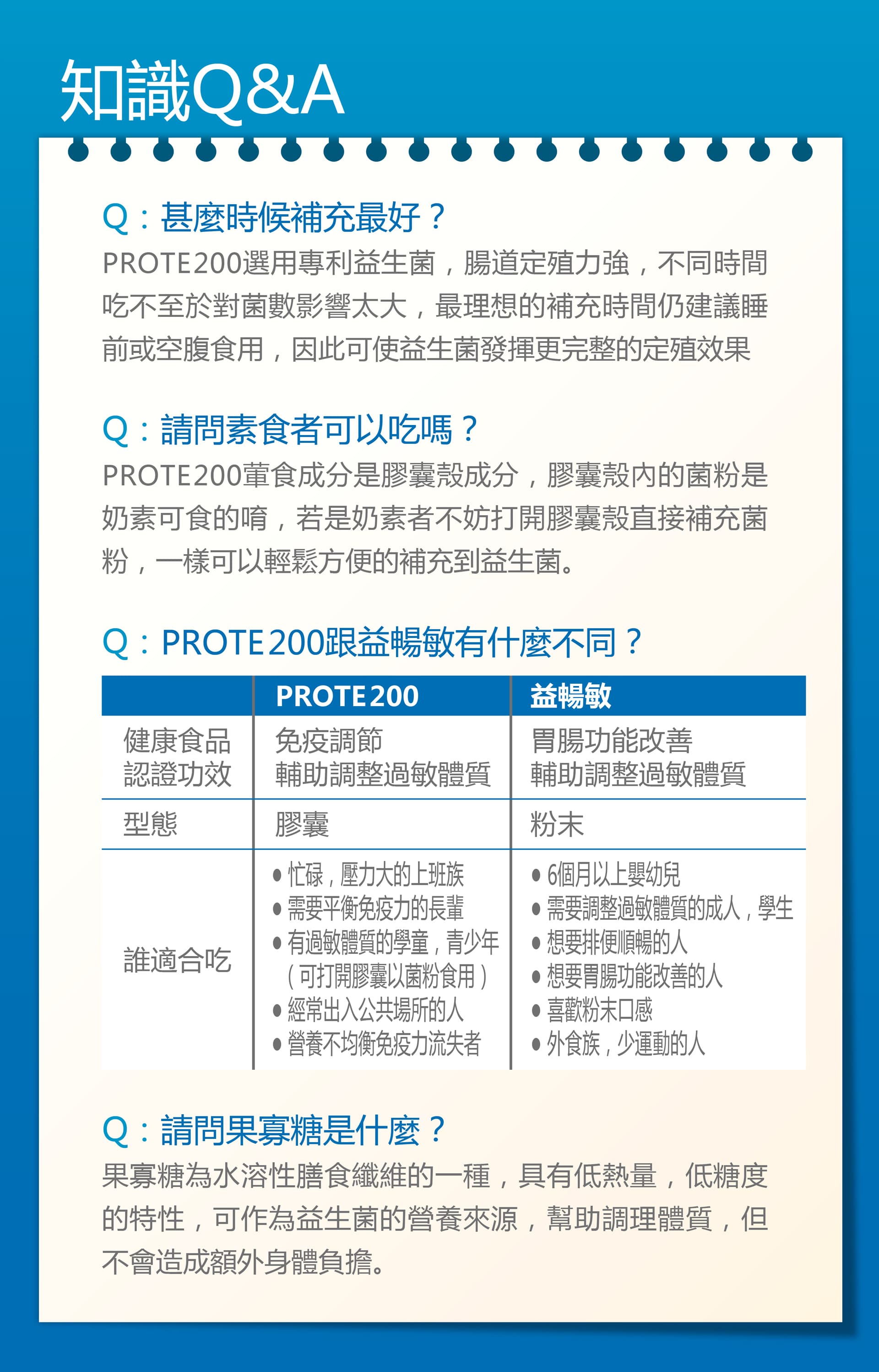 乳酸菌菌粉(Lactobacillus Paracasei副乾酪乳桿菌、麥芽糊精)、果寡糖粉(玉米澱粉、果寡糖)、微結晶狀α-纖維素、二氧化矽、硬脂酸鎂。膠囊成分:明膠、硫酸月桂酯鈉、二氧化鈦、純水、甘油