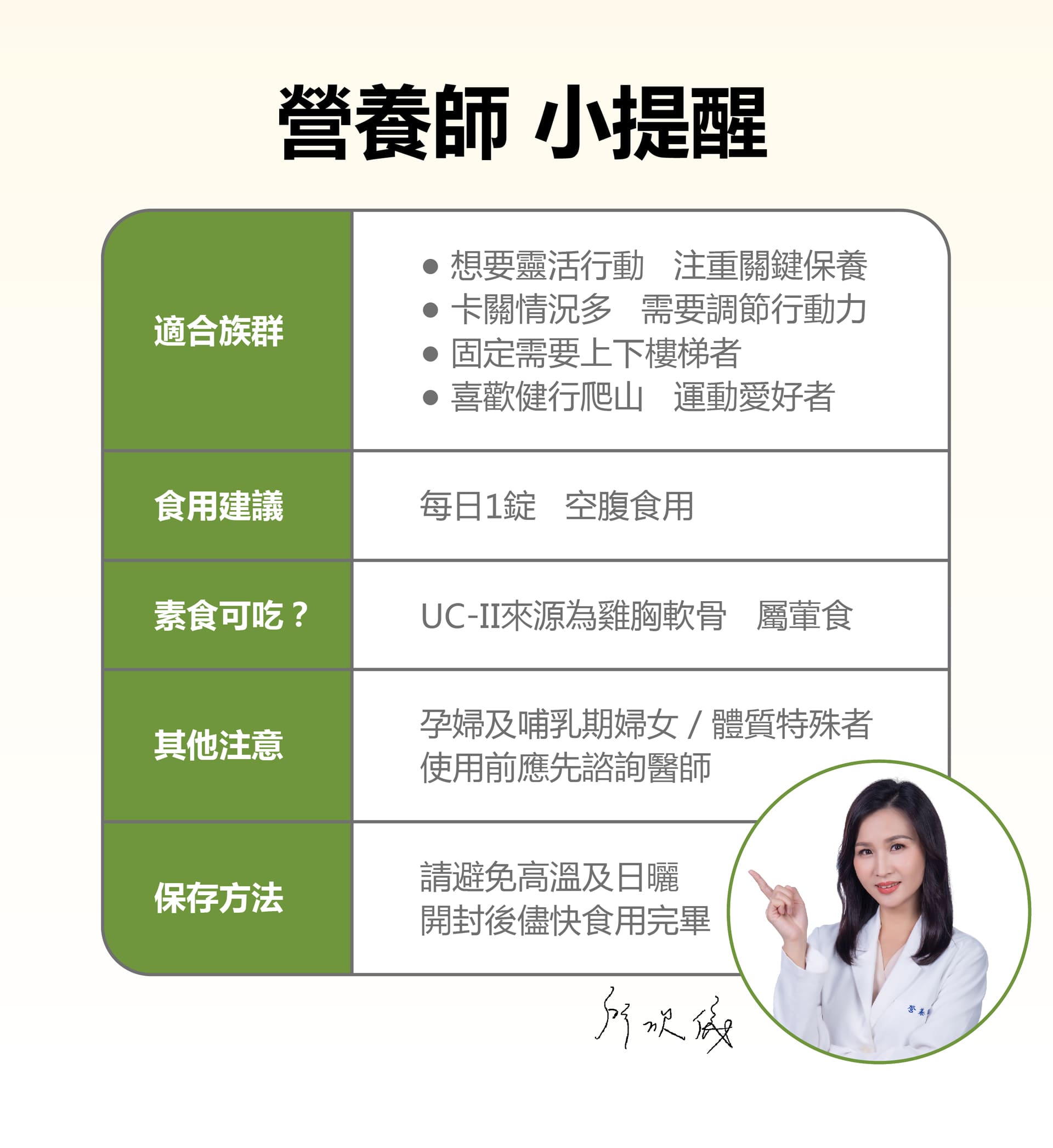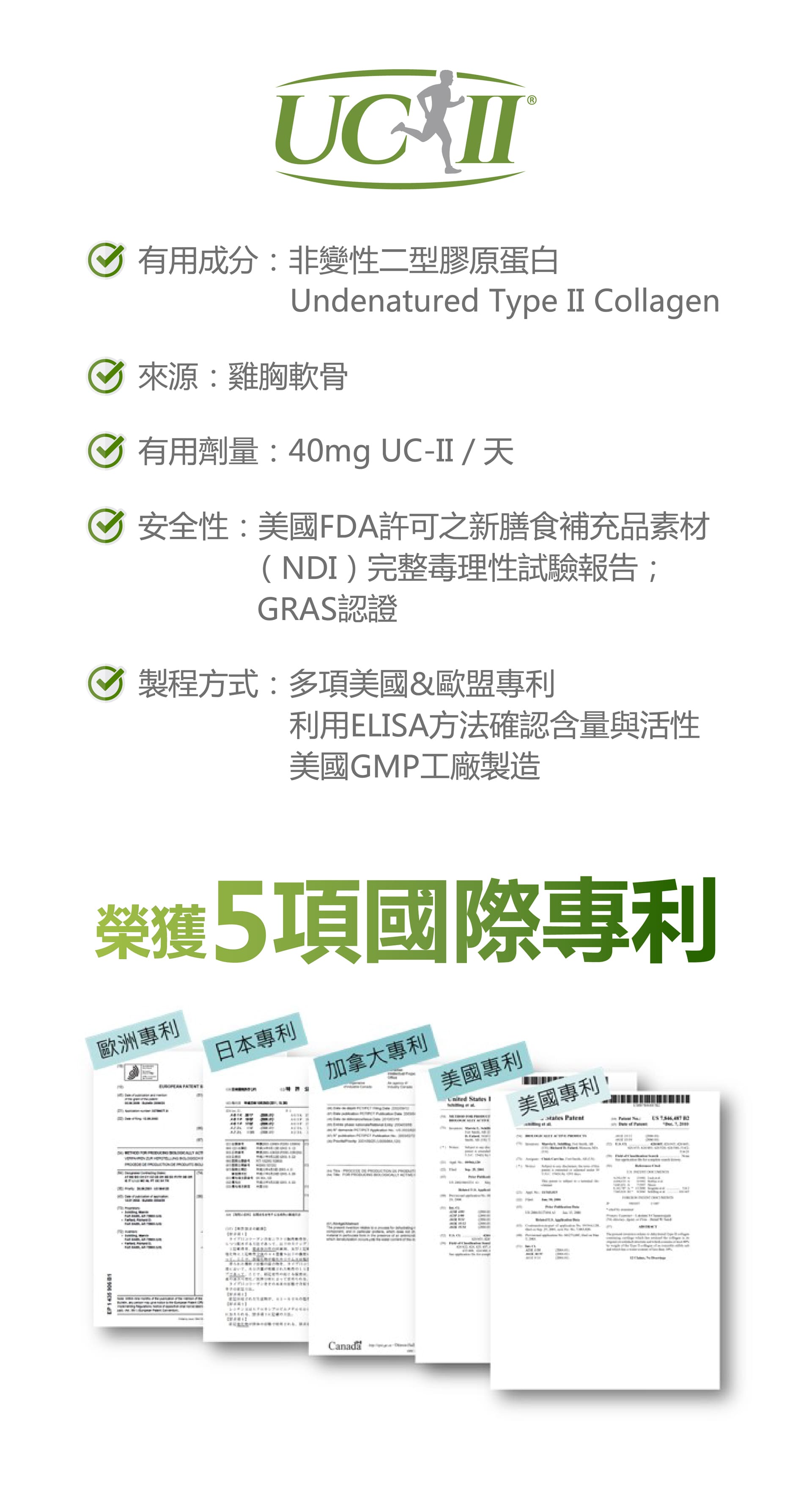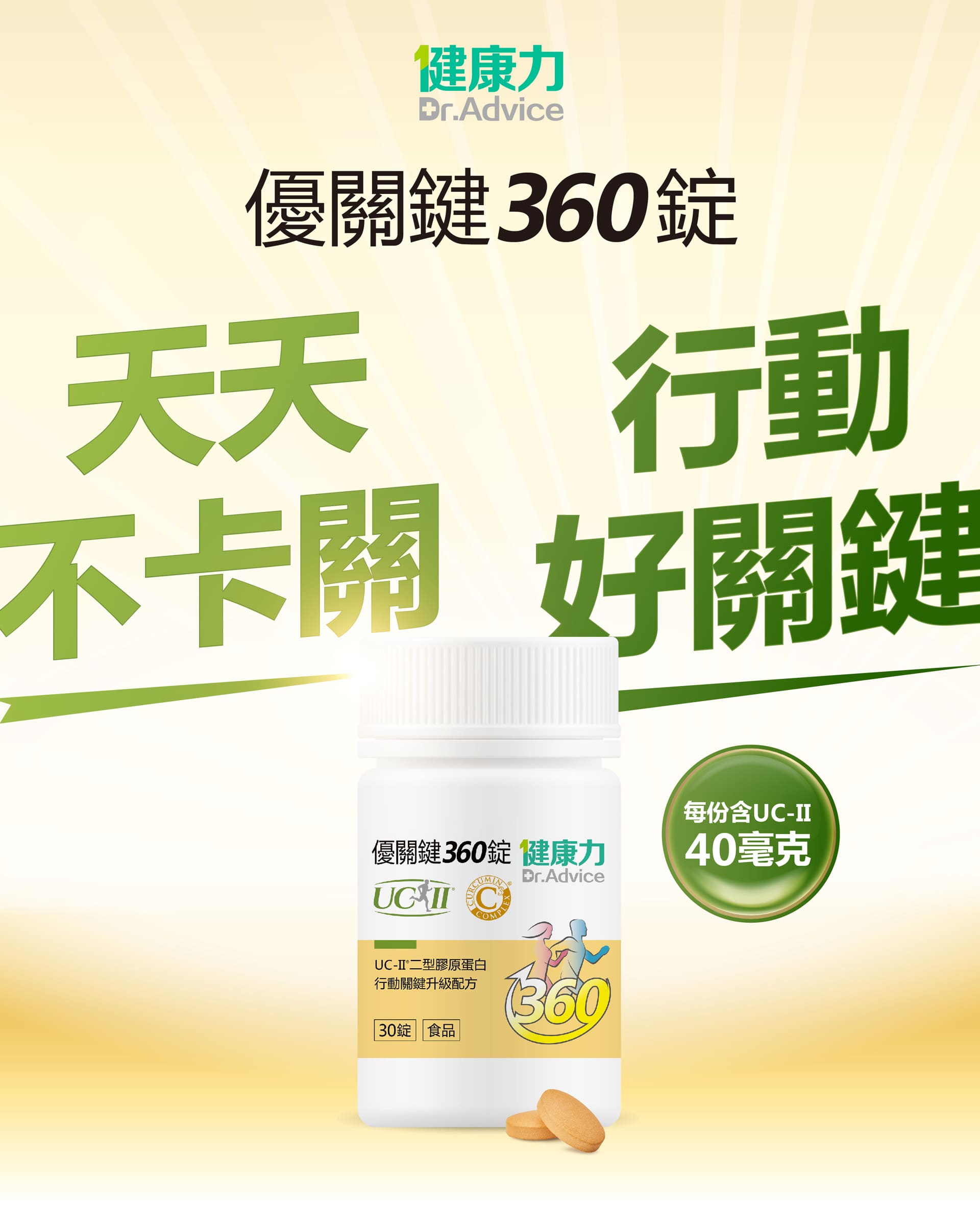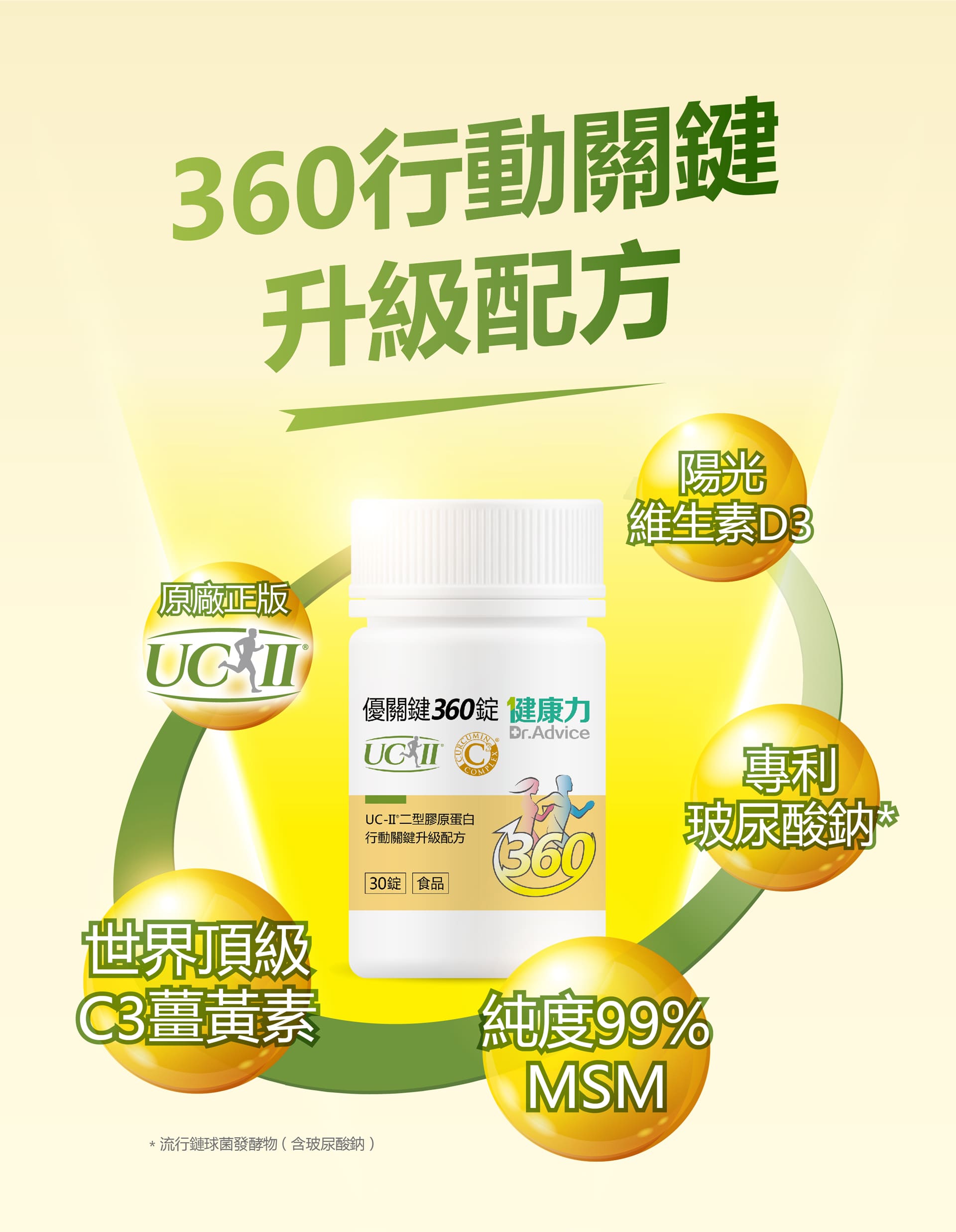 微結晶狀α-纖維素、甲基硫醯基甲烷(甲基硫醯基甲烷、二氧化矽)、薑黃抽出物、流行鏈球菌發酵物(含透明質酸鈉)、UC-II®膠原蛋白複合物【雞胸軟骨(含二型膠原蛋白)、氯化鉀】、硬脂酸鎂、維生素D3【修飾澱粉(辛烯基丁二酸鈉澱粉)、蔗糖、抗壞血酸鈉(維生素C)(抗氧化劑)、中鏈三酸甘油酯、二氧化矽、維生素E(抗氧化劑)、膽鈣化醇(維生素D3)】、二氧化矽。膜衣成分:白色水性膜衣(聚乙烯醇、滑石粉、二氧化鈦、脂肪酸甘油脂、硫酸月桂酯鈉)、食用黃色四號鋁麗基、食用黃色五號鋁麗基、二氧化鈦。作用