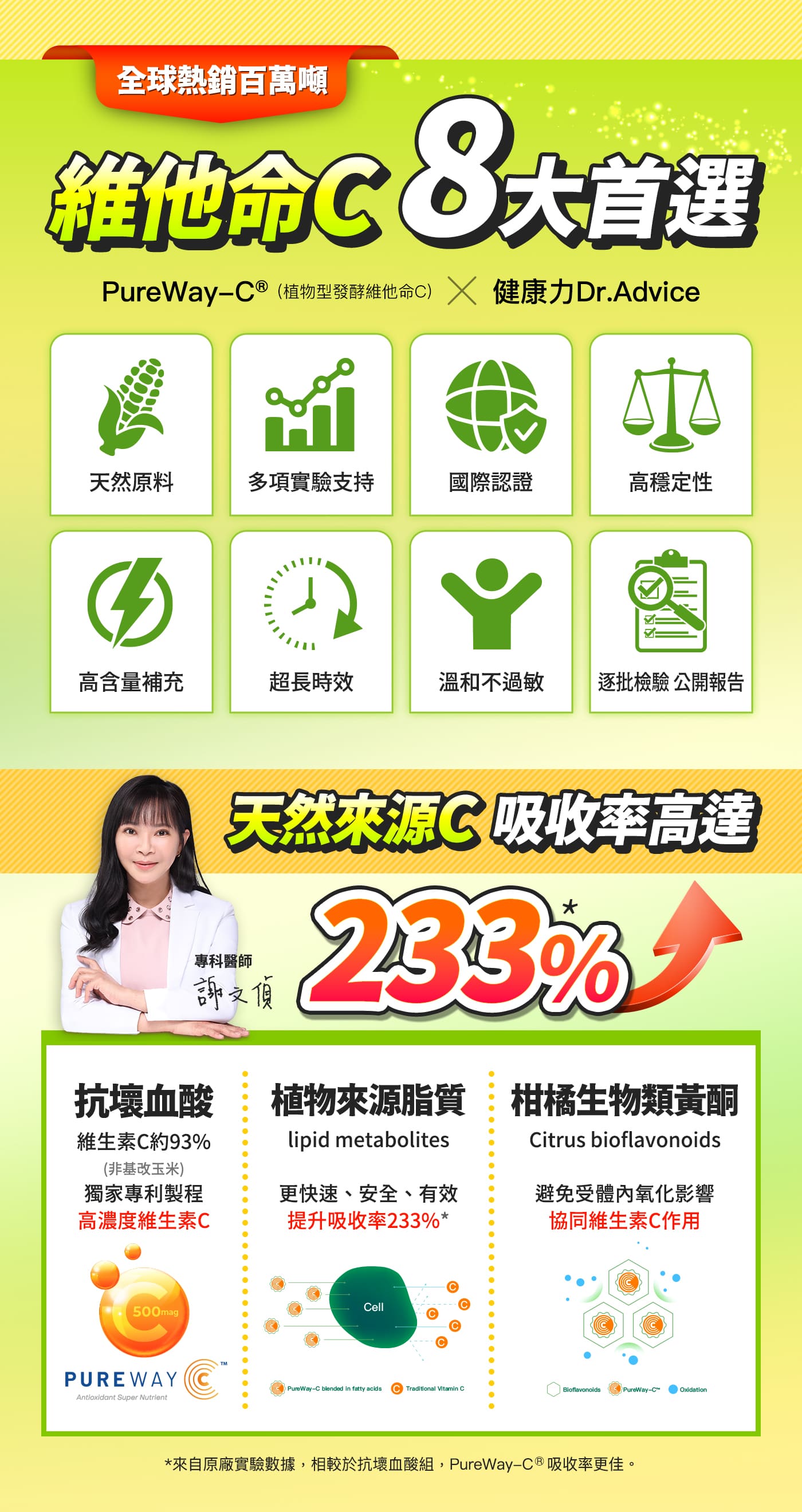 PUREWAY-C®複方維生素C【抗壞血酸(維生素C)、柑橘萃取物、米糠粉】、羥丙基甲基纖維素、微結晶狀α-纖維素、聚乙烯吡咯烷酮、白色水性膜衣(聚乙烯醇、滑石粉、二氧化鈦、脂肪酸甘油酯、硫酸月桂酯鈉)、硬脂酸鎂、二氧化矽、食用黃色四號鋁麗基、二氧化鈦、食用黃色五號鋁麗基作用