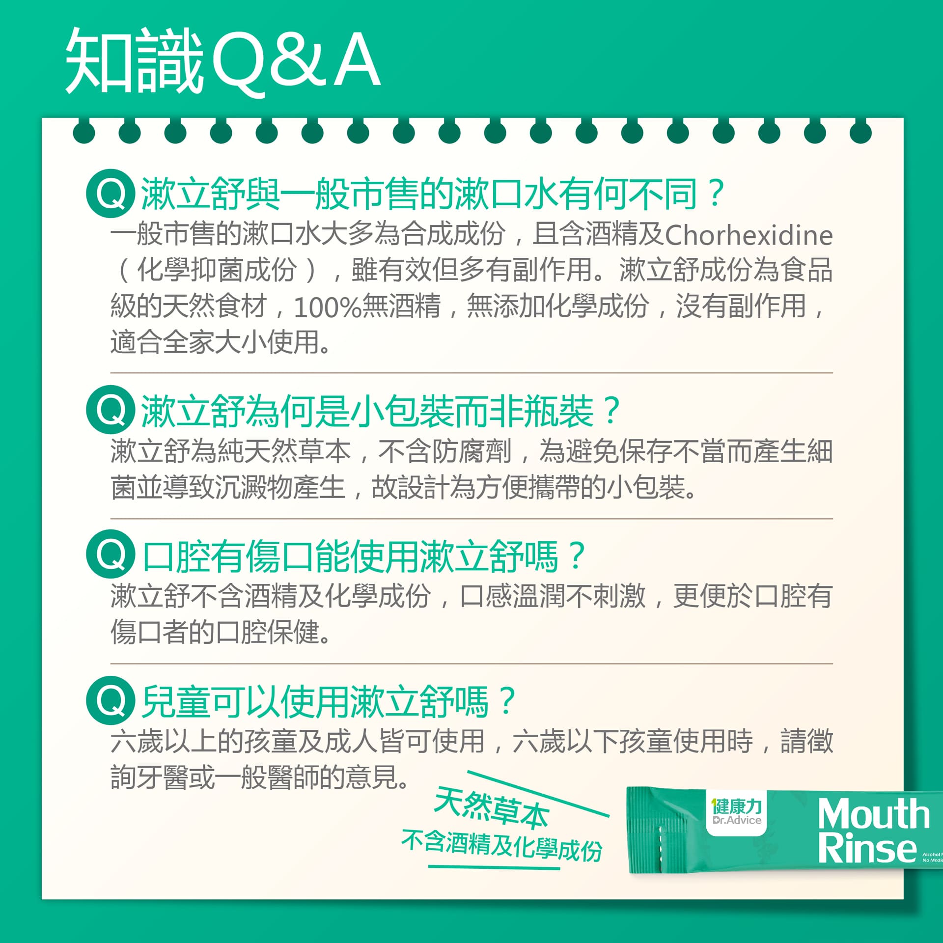 漱立舒可淨化口腔、去除口腔異味,配合正確刷牙習慣,可控制牙菌斑及預防牙周病,輕鬆養成口腔保健好習慣!